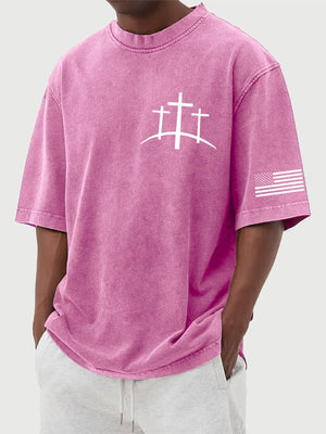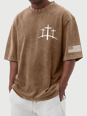 Men's Flag Faith Cross Printed Cotton Washed T-Shirt