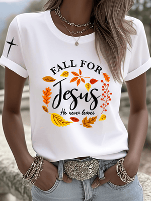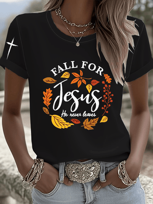 Women's Fall For Jesus He Never Leaves Print Round Neck T-shirt
