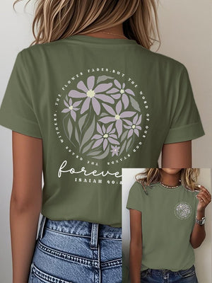 Women's “The Grass Withers, The Flowers Fade, But The Word Of Our God Will Stand Forever, Isaiah 40:8 Bible” Print Casual T-Shirt