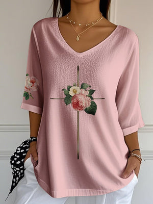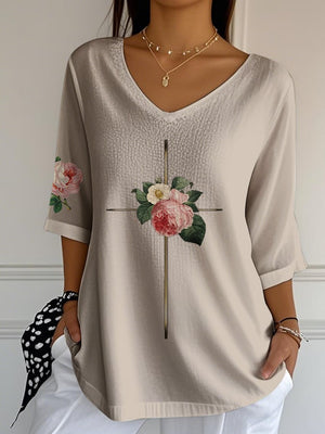 Women's Vintage Floral Metal Cross V-Neck T-Shirt